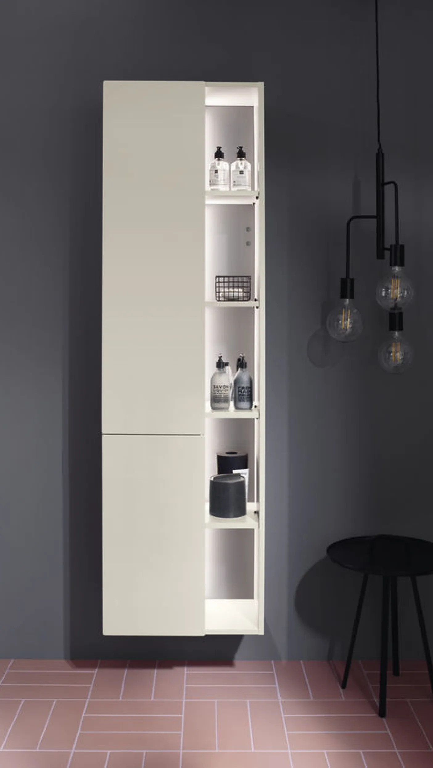 Für die perfekte Abrundung sorgen die in verschiedenen Farbkombinationen erhältlichen Hoch- und Halbhochschränke (1.760 mm bzw. 980 mm Höhe, 320 bzw. 325 mm Tiefe, 350 mm Breite) von Badu, teils mit integrierter Wäschekippe. Sie vereinen attraktiven Stauraum mit ansprechendem Design und können auf Wunsch mit einer LED-Innenbeleuchtung ausgestattet werden.