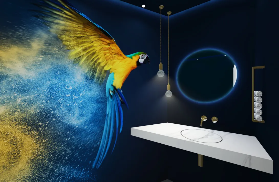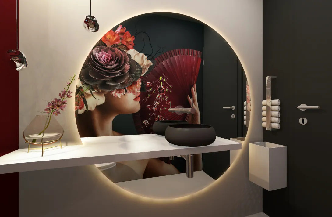 Exklusives Gäste-WC mit floraler Wandgrafik, modernem Waschtisch und indirekter Beleuchtung.