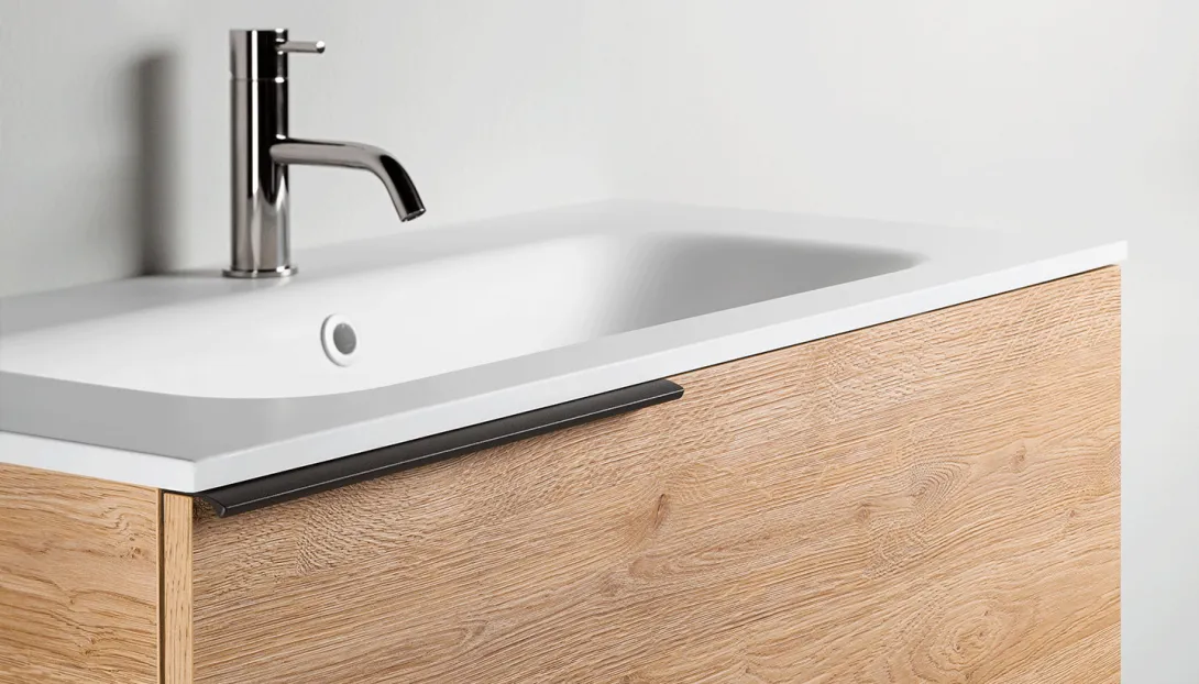 Detailansicht eines Stocco Badmöbels mit dunkler Holzfront, weißer Waschtischplatte und schwarzen Griffleisten.