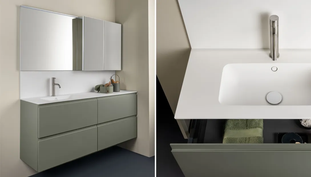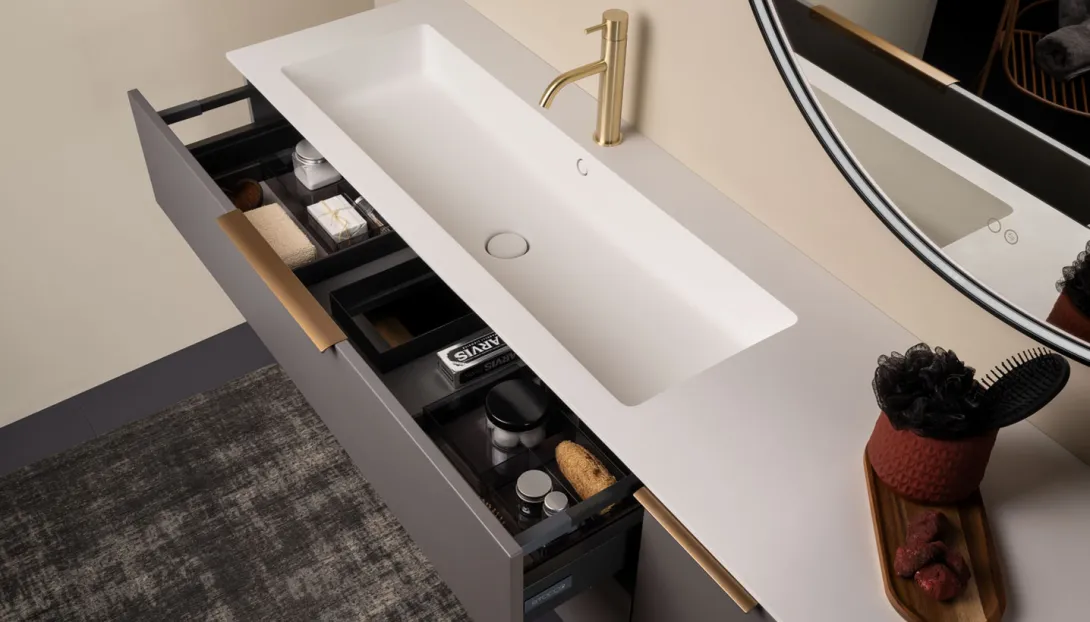 • Kombinierbar mit integrierten Becken, Aufsatzwaschbecken, offenen Elementen und Unterschränken