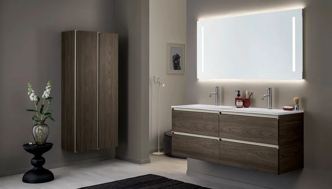 Großzügiges Badezimmer von Stocco mit langem, schwebendem Doppelwaschtisch in Grau, Holzabdeckung und wandmontierten Armaturen vor Spiegelfront..